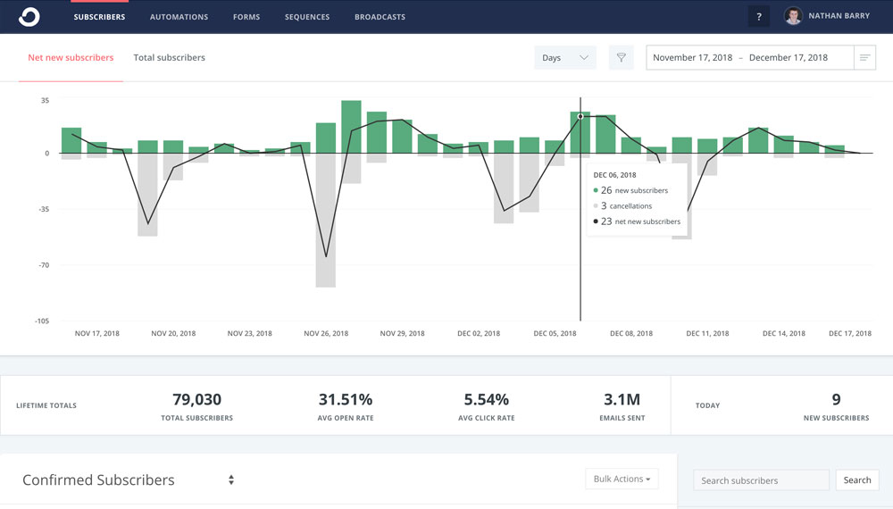The most recent interface change we made was to change the default graph when you sign in. Before it showed your total subscriber growth over time, but now it shows the subscribers you’ve gained and lost each day. It’s more actionable in the short-term, whereas the other graph (which is just one click away) is better for stats over time.