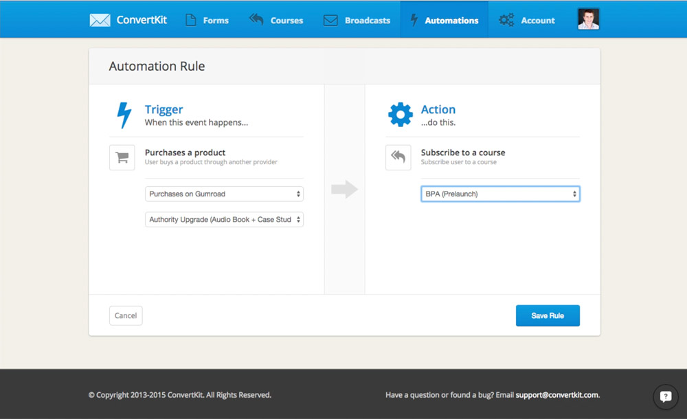 In 2015 we started to make a lot more progress on development now that there was a team working on ConvertKit full-time. The first move we made was to build out a trigger/action based automation rules system. We launched it with a direct integration with Gumroad where you could add a customer to a form after they bought a product.