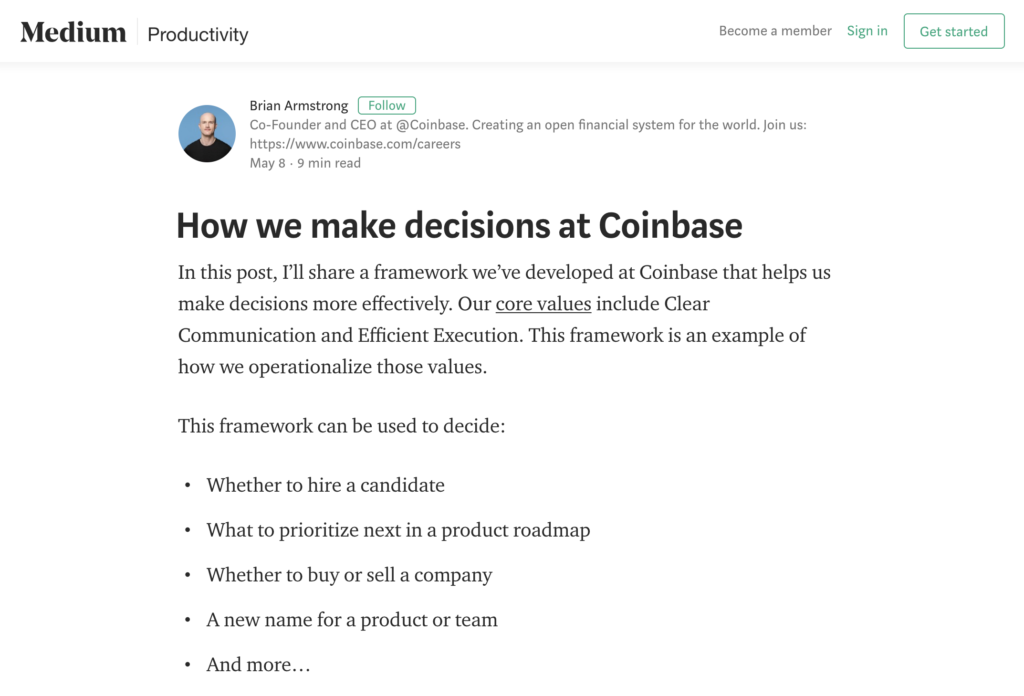 Even though I’m a fan of mental models, I didn’t ever think about establishing a decision making process. Then the leadership team at ConvertKit came across a post from Coinbase about how they make decisions. At the same time we had received feedback from our team that unclear decision making made it hard to trust us as leaders.