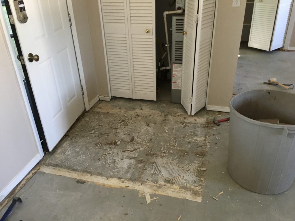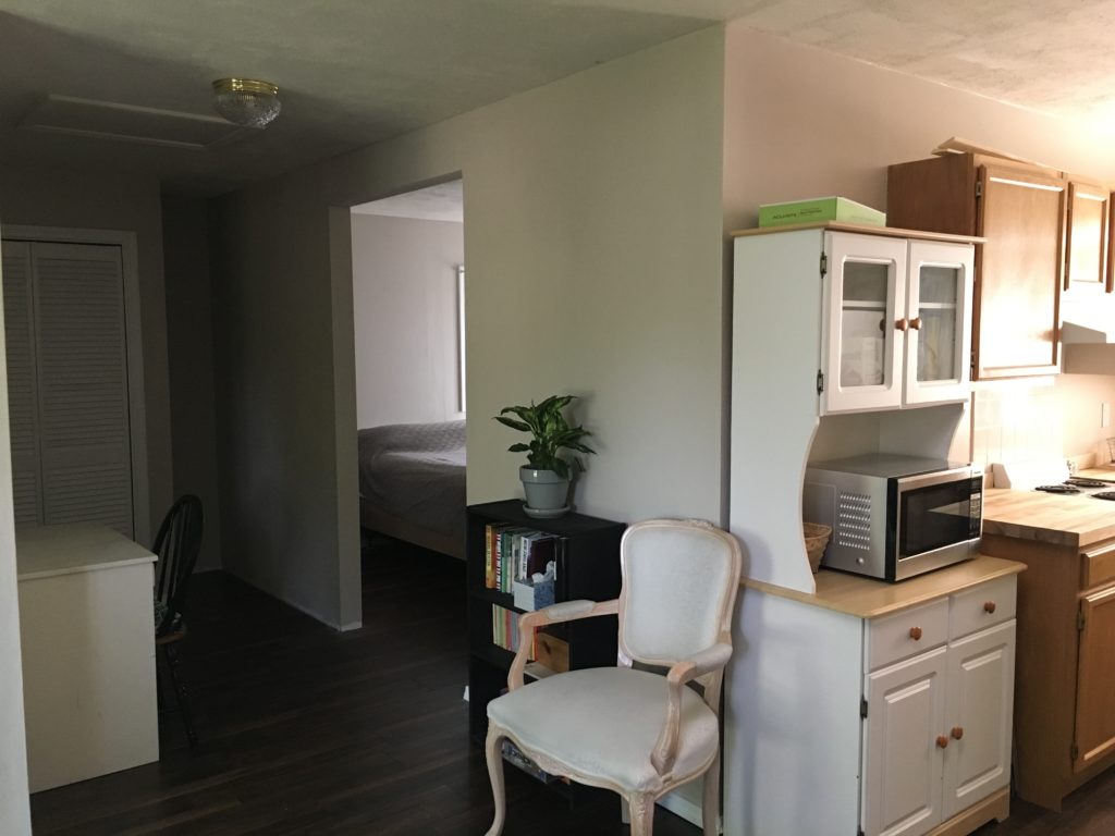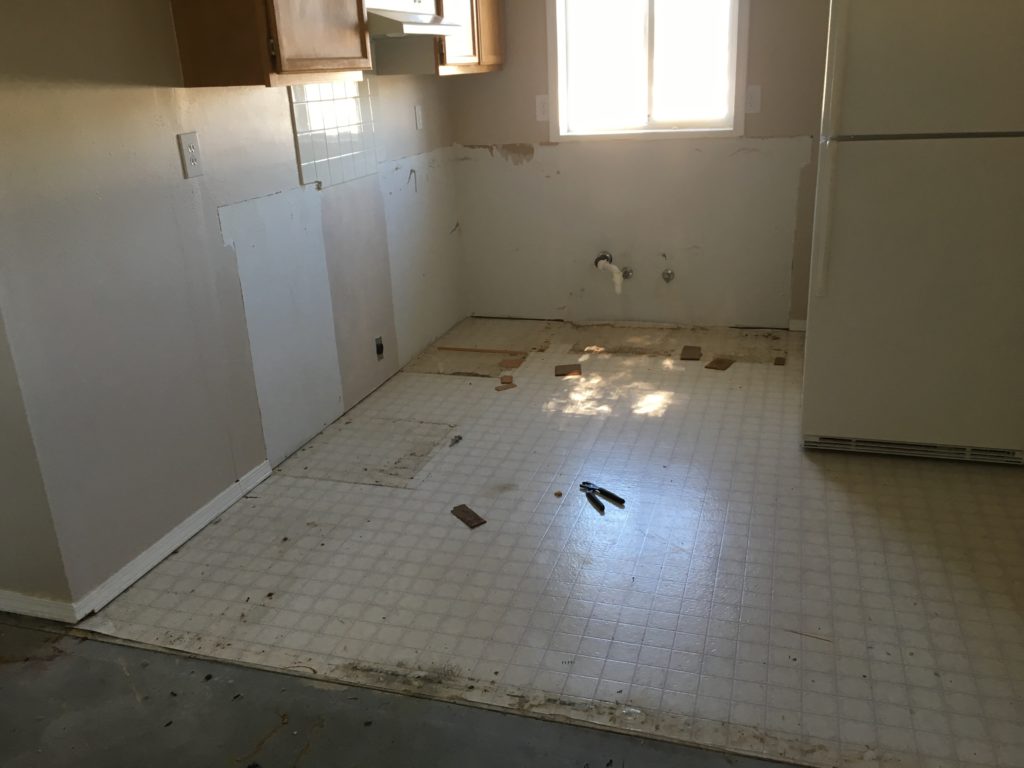The place was pretty good, but still needed some help. The floors were a mix of old carpet, linoleum, and tile. The kitchen counters and cabinets definitely looked dated. And there was room for it to be a one bedroom place, instead of a studio if we just built another wall and added a door. The wall is done, but the door will have to wait until a time when we have a gap in our guests.