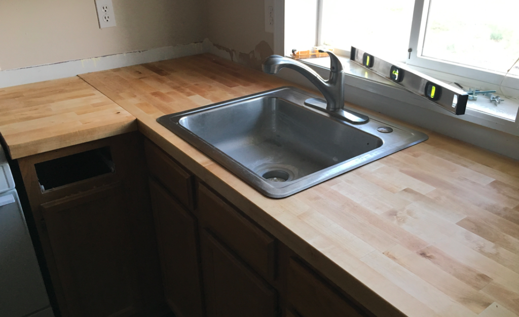 With family members coming in from out of town to stay with us for a month I didn’t have time to finish everything, but we got enough done that it was quite livable. Really we just had painting the cabinets and some other finish work left to do. Though it meant that I had to find a last minute solution for new countertops. I was able to buy butcher block countertops from Lowes for about $300 and install them in half a day.