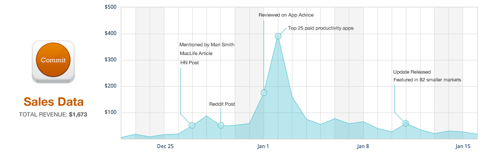 Commit was released on December 22nd, to mediocre sales numbers. I didn’t expect it to get approved before iTunes Connect closed (on the same day), so I didn’t even have the marketing page up yet. So the first day was spent scrambling to write a design a page that throughly explained Commit.