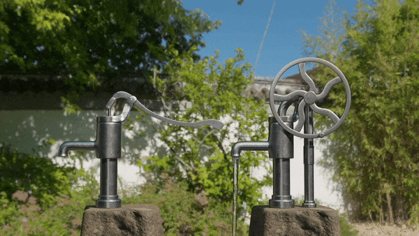 The flywheel was a large metal disk that used a rotational force to pump instead of a linear up and down force. It was incredibly hard to get started (it took two of us with all of our strength to get a single rotation), but it got easier with every rotation. Once the flywheel had momentum, I could spin it easily with one hand.