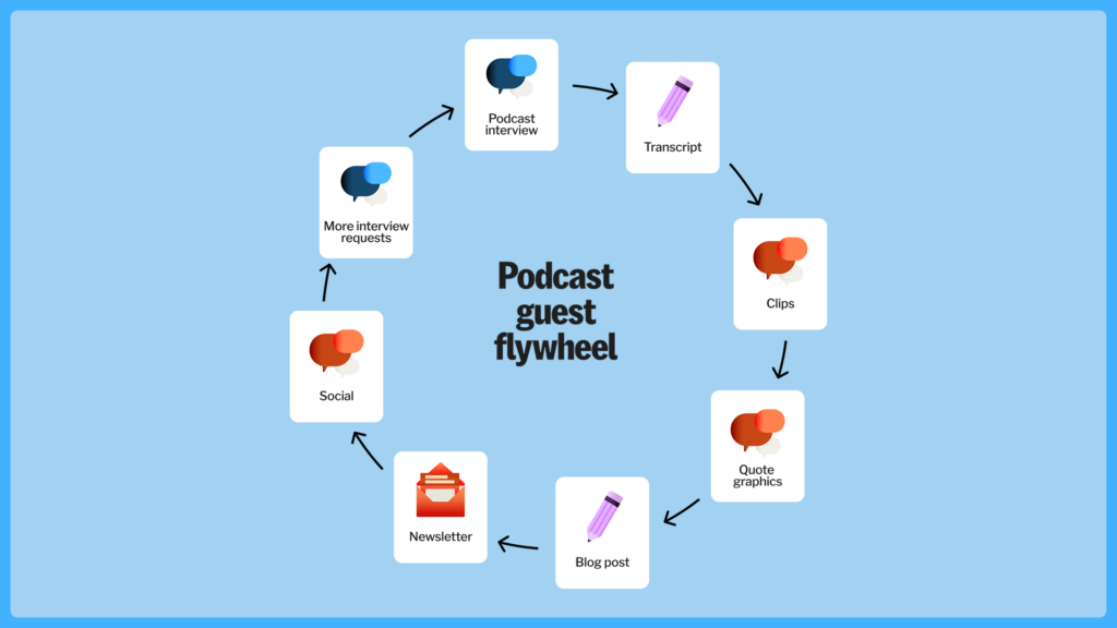 Posting clips, threads, and carousels on social media will increase your visibility even further and result in you getting on more podcasts and feeding the flywheel.