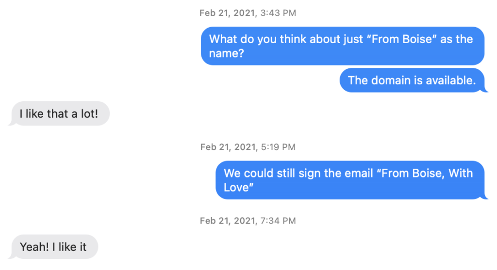 Marissa and I were texting and she suggested “The Boise Connecter” which is owned by someone else (but not used). I said I could reach out when she made a few other suggestions: