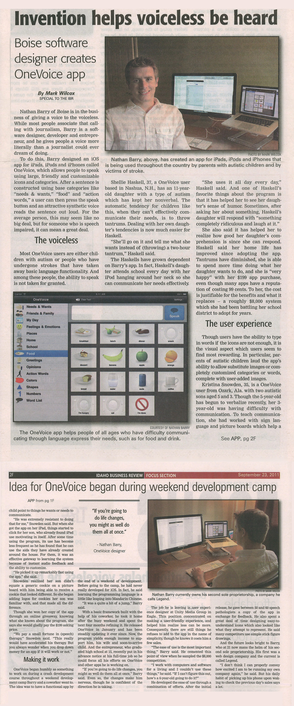 OneVoice was featured last week by the Idaho Business Review. Reporter Mark Wilcox explains better than I can why OneVoice is important and should be my full-time focus. Which is why I am leaving my job as Sr. User Experience Designer at Unity Media Group. You can find out more about OneVoice at the Legend website.