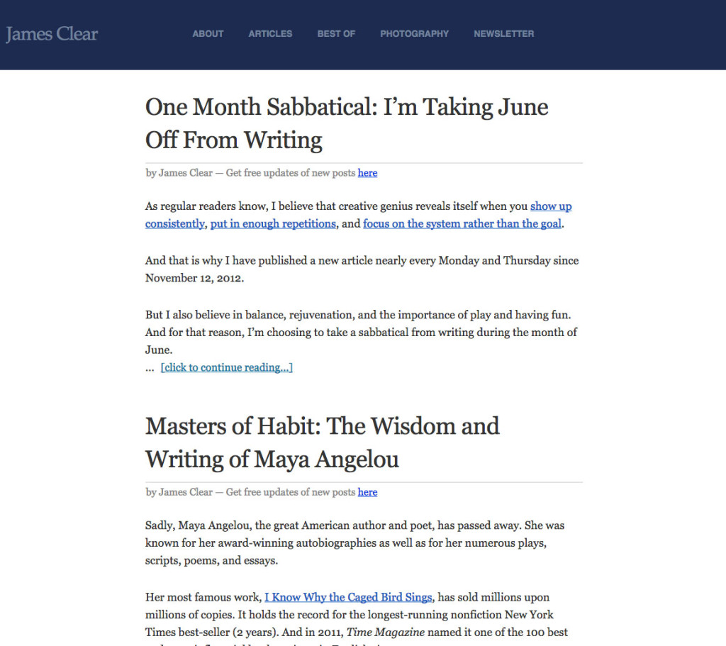 A couple weeks ago I was up in the mountains of North Carolina with a few of close friends for a mastermind retreat. During one of our feedback sessions James Clear asked for feedback on his wildly popular blog. That gave me a chance to mention something that I’d been thinking about for a while: I felt his site design didn’t live up to the quality of his content.