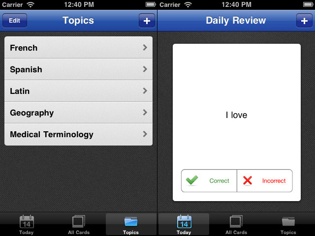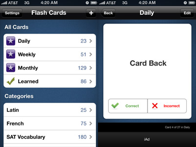 - Be able to review cards immediately after launch. Launch the app, review flash cards. Once the cards are loaded that is the workflow. No need to worry about what you should be reviewing that day or navigating screens to find the right cards. I wanted to be able to stand in line at the grocery store and quickly review French vocabulary.